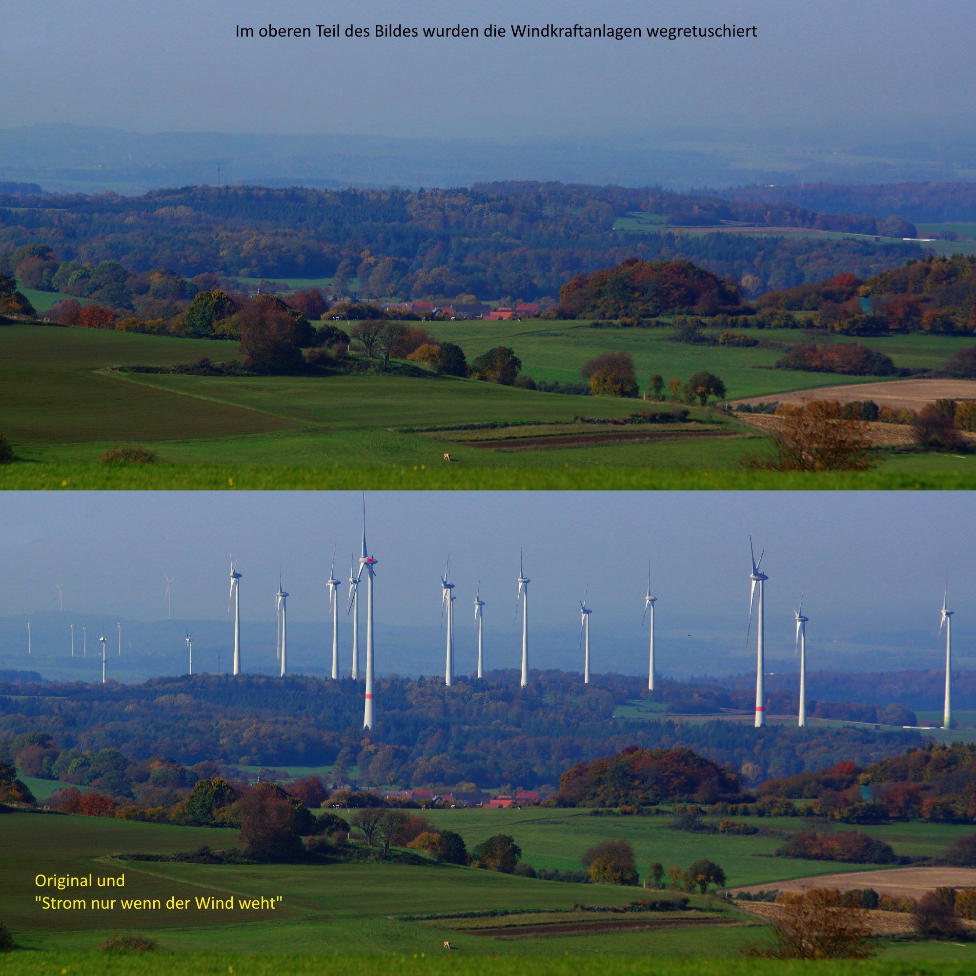 Auf dieser Seite haben wir Fotos von durch Windkraft zerstörter Landschaften zusammen gestellt. Auf den Fotos wurden die, für eine zuverlässigen Stromproduktion, unsinnigen Windkraftanlagen entfernt und dem Original gegenüber gestellt. Jeder kann sich selbst ein Bild von der Natur- und Landschaftszerstörung machen.