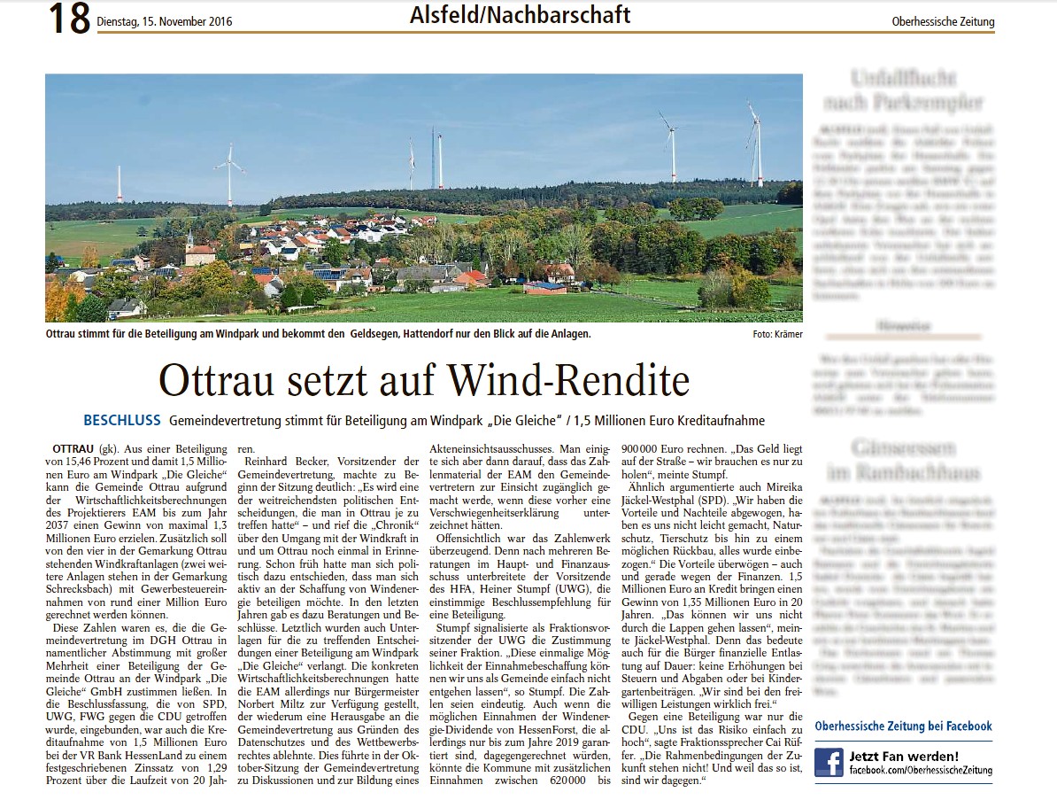 Ottrau setzt auf Wind-Rendite schreibt die OZ.
