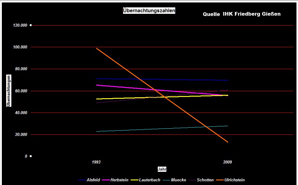Durch hohe Erwartungen mit Windkraft Geschäfte zu machen, wurde von da an auf den Tourismus keinen Wert mehr gelegt. Wie viele Menschen waren wohl noch 1993, also ein Jahr vor dem ersten Ulrichsteiner Windrad in der Tourismusbranche in Ulrichstein tätig? Die Übernachtungszahlen lagen im Jahr 1993 bei stolze 99.000 Übernachtungen. Hessen höchstgelegenes Städtchen führte die Hitliste der Vogelsberger Gemeinden und Städten an.