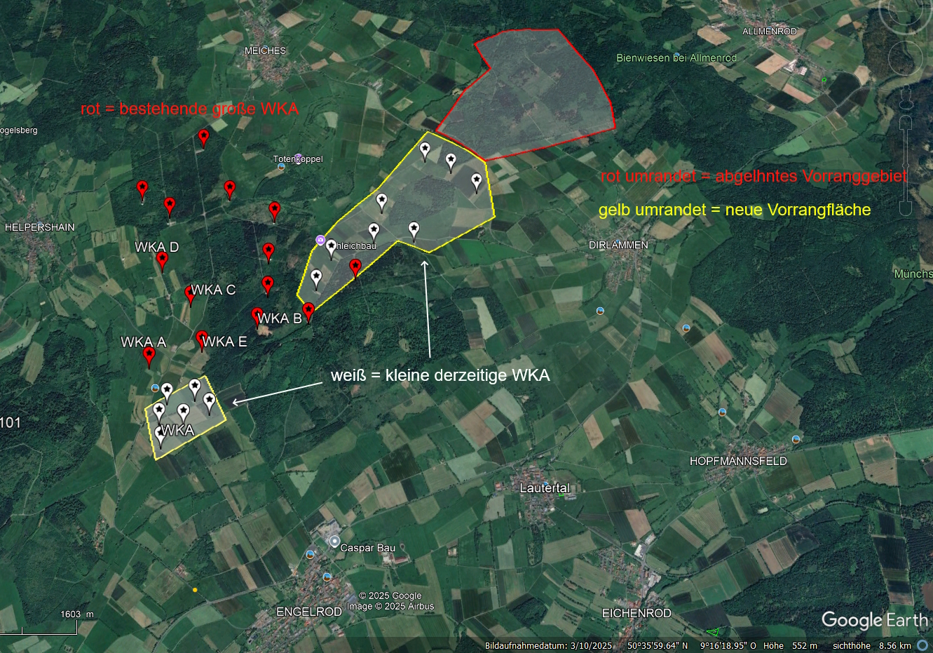 Hatte die Regionalversammlung, mittels extra beauftragten Naturschutzgutachen, das Gebiet als Vorrangfläche zur Nutzung der Windkraft ausgeschlossen, läßt nach der Einführung der Gemeindeöffnungsklausel durch den Fantast Habeck, die OVAG (Hessenenergie) ihre Maske fallen und schert sich ein Scheiß um die Natur.