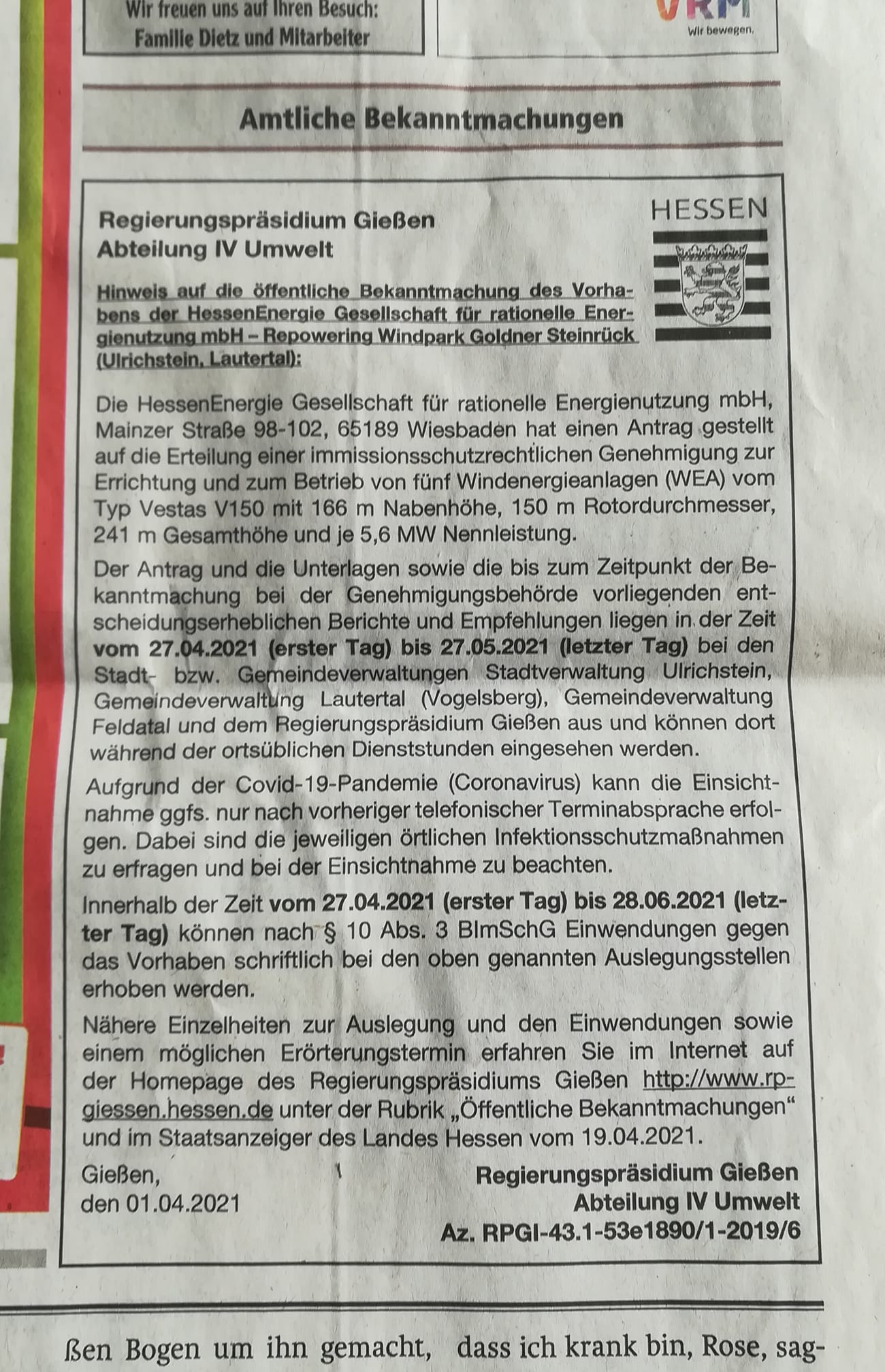 Im Jahr 2016 genehmigte das RP Gießen 400.669 Quadratmeter neue Windwahn-Todeszonen