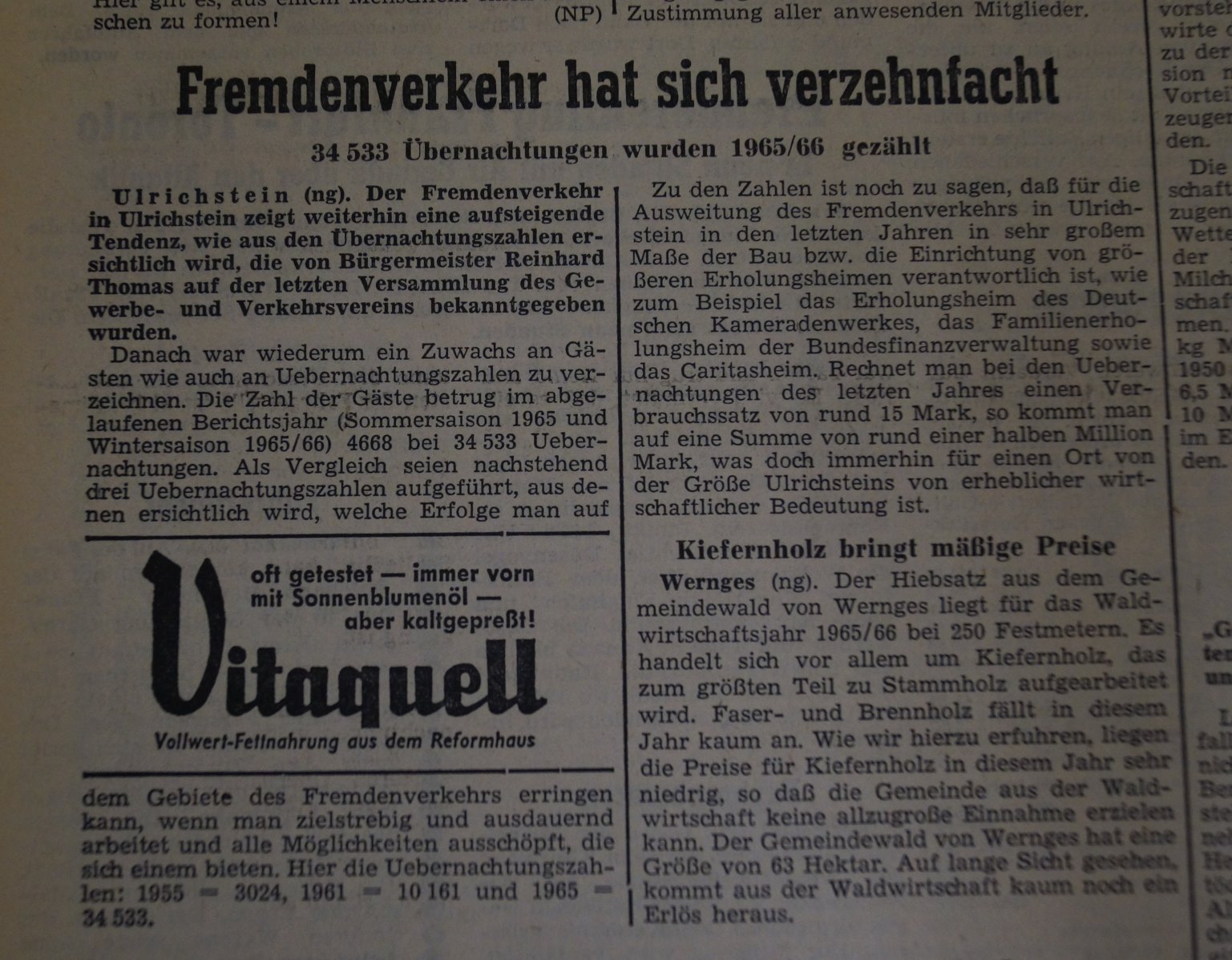 Zitat: "Rechne man bei den Übernachtungen des letzten Jahres einen Verbrauchssatz von rund 15 Mark, so kommt man auf eine Summe von rund einer halben Millionen Mark, was doch immerhin für einen Ort von der Größe Ulrichsteins von erheblich wirtschaftlicher Bedeutung ist.