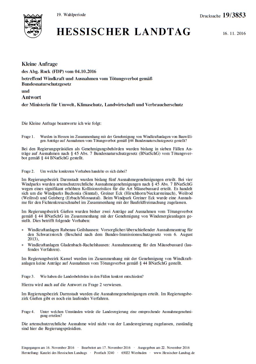 Im Regierungsbezirk Darmstadt wurden bislang fünf Ausnahmegenehmigungen erteilt. Bei vier Windparks wurden artenschutzrechtliche Ausnahmegenehmigungen nach § 45 Abs. 7 BNatSchG wegen eines signifikant erhöhten Kollisionsrisikos für die Art Mäusebussard erteilt.