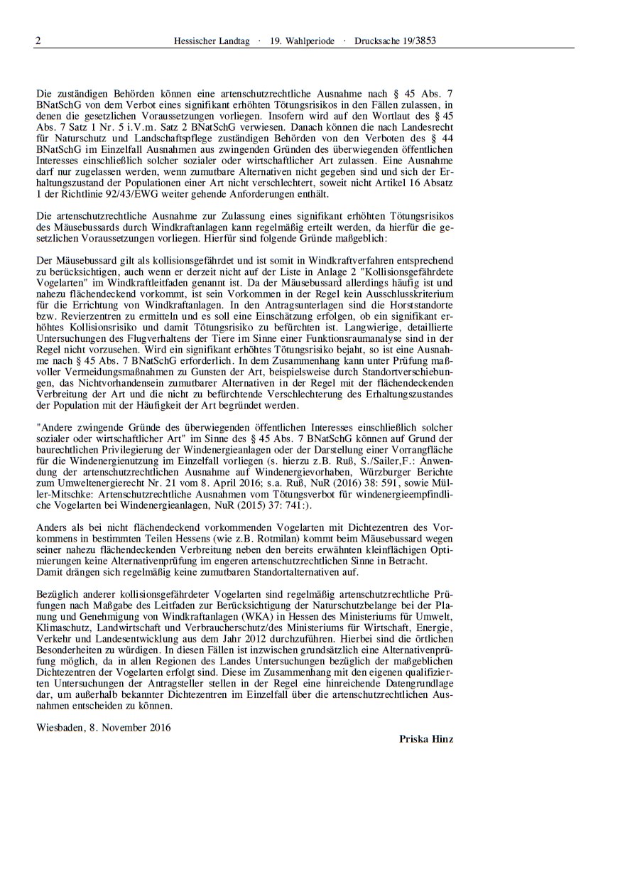 betreffend Windkraft und Ausnahmen vom Tötungsverbot gemäß Bundesnaturschutzgesetz