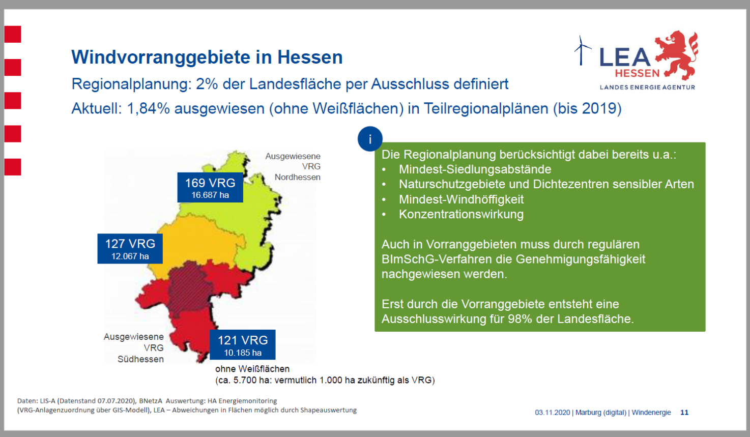 He? Schon auf Folie Nr. 5 wird von der LEA von 28 TWh/anno Windstromerzeugung in Hessen verkündet. Wohlgemerkt auf 2 % der Landesfläche.