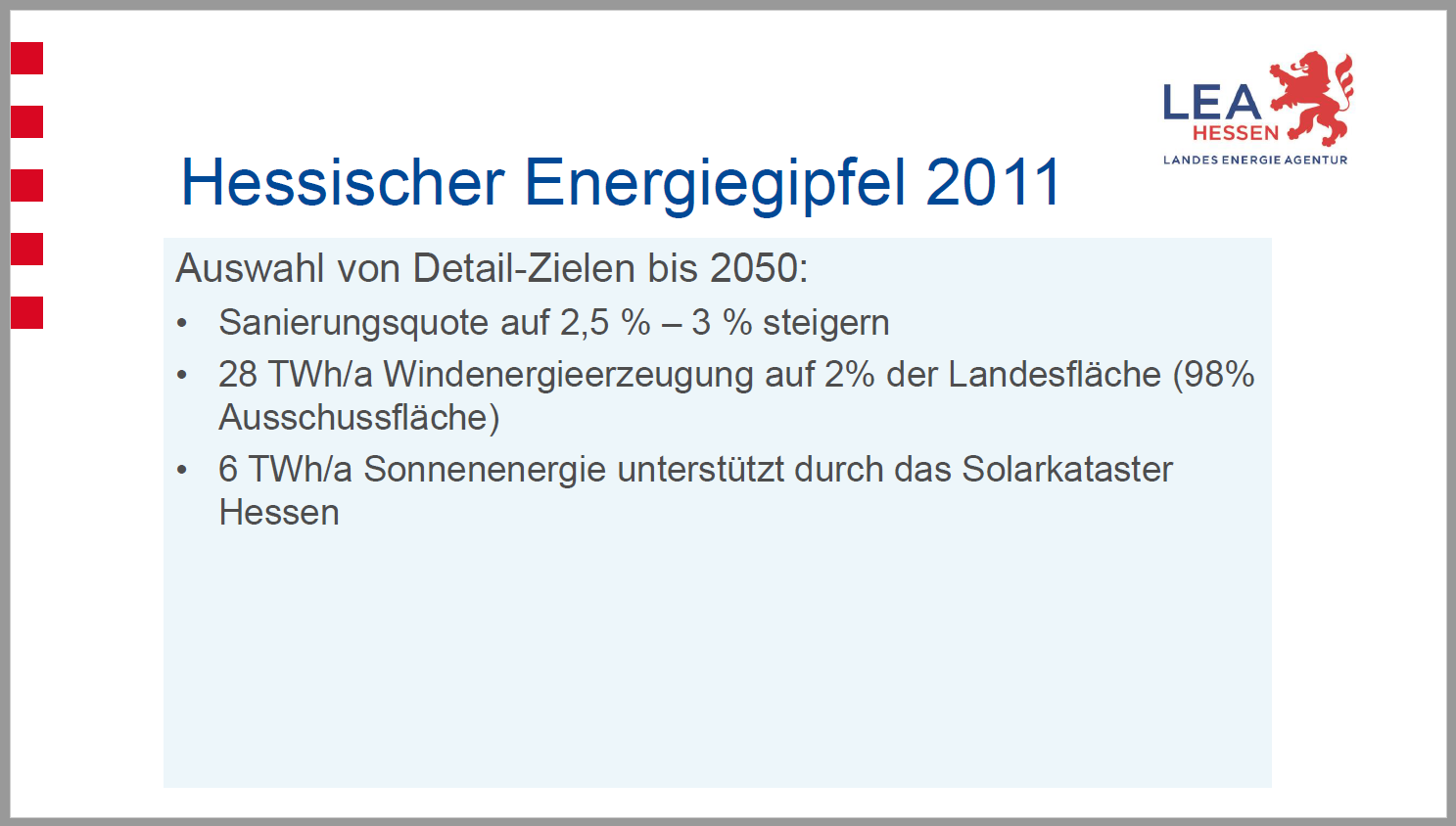 Auf Folie 5 werden Zahlen des hessischen Energiegipfels 2011 präsentiert und dort findet man die zu erwartende Stromproduktion mittels Windkraft in Hessen von 28 TWh im Jahr 2050