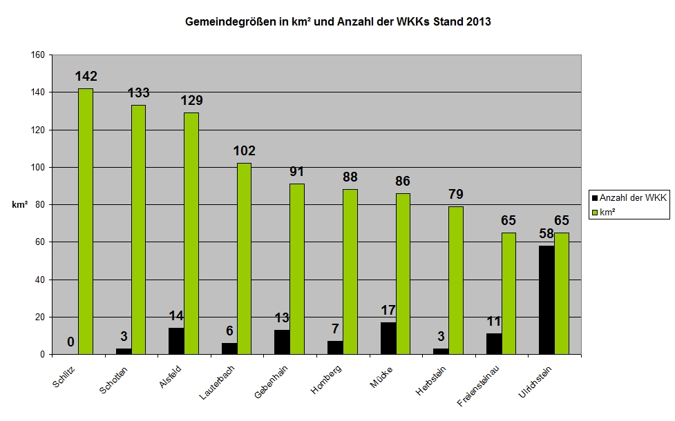 Wie stark die Windindustrie auf touristische Entwicklung in Ulrichstein Einfluss hat, erkennt man, wenn man die Größe der Gemeindeflächen in Realition zu der Anzahl der Windindustrieanlagen sieht. Wie die nachfolgende Grafik überdeutlich zeigt.