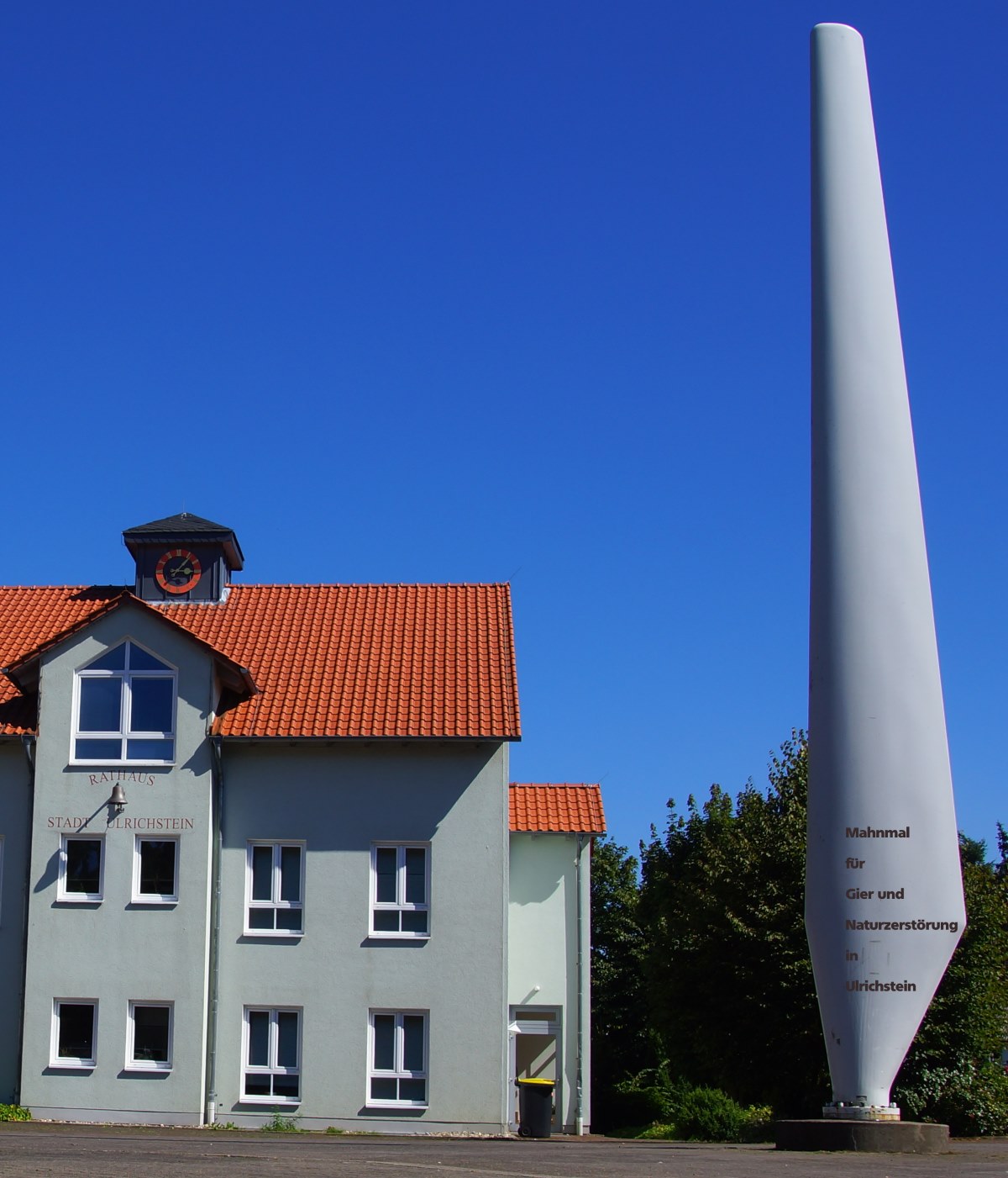 Der erste Windpark in einem deutschen Mittelgebirge wurde im Jahre 1994 in Ulrichstein errichtet. Seitdem fahren die Stadtverantwortlichen voll auf diese, für die Stadt ertragreiche Einnahmequelle ab. Um ihr Gewissen zu beruhigen hat man eine Möglichkeit aus dem Mittelalter wieder entdeckt. Ein prunkvolles, für diesen kleinen Ort, überdimensioniertes Rathaus, zeugt von dem Reichtum des kleinen Städtchens. Die schön herausgeputzten kleinen Fachwerkhäusern kam dieser Reichtum ebenfalls voll zu gute.