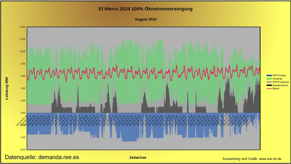 "Das Märchen von der 100% Insel – Die Realität im Rekordmonat August 2024" Diese Grafik zeigt den Monat mit der absolut höchsten Ökostromerzeugung des Jahres. Doch wer genau hinsieht, erkennt: Die schwarzen Flächen (Dieselkraftwerk) verschwinden nie. Selbst im 'Best Case' kann das millionenschwere System aus Wind und Wasser keine einzige Stunde autarke Versorgung garantieren. Ein teurer Etikettenschwindel auf Kosten der Steuerzahler."