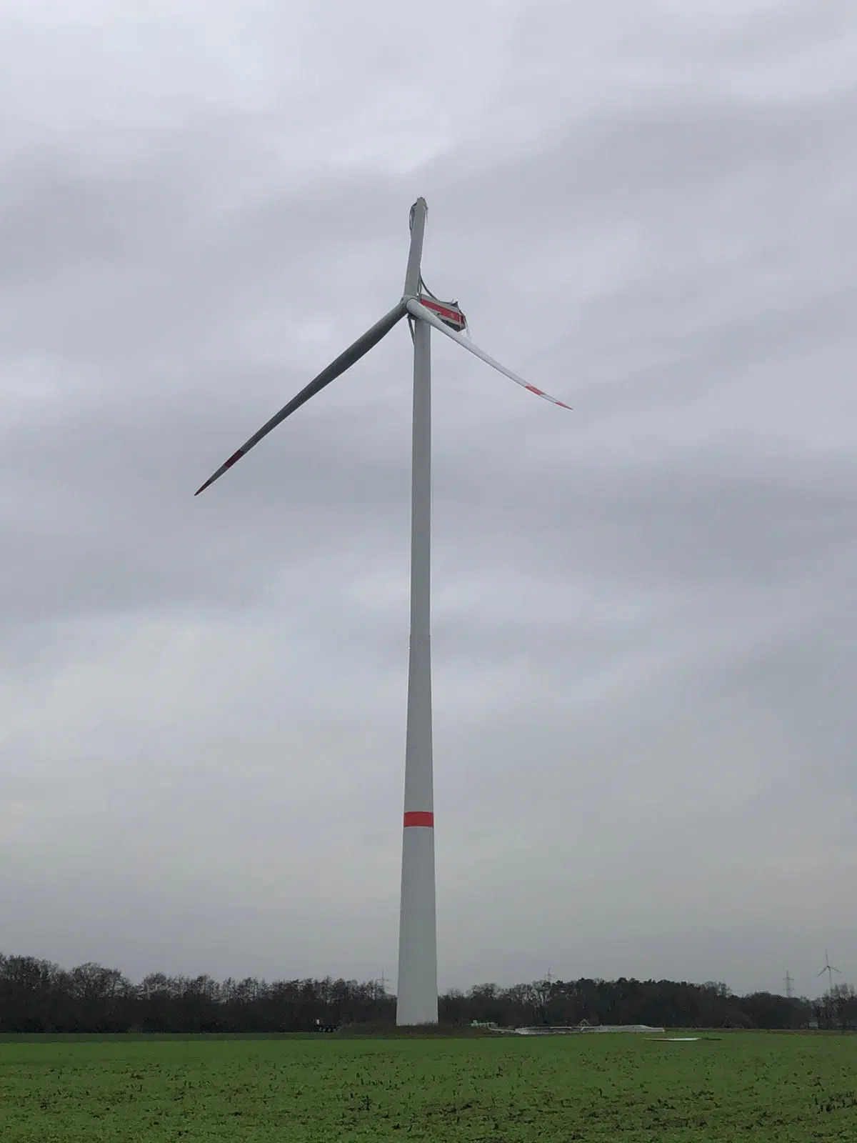 "Lange war die „Bürgerwind-Anlage“ Gronau Epe noch nicht in Betrieb. Zwei Windkraftanlagen wurden 2021 fertiggestellt. Bei einer Anlage ist heute Morgen ein Flügel abgebrochen.