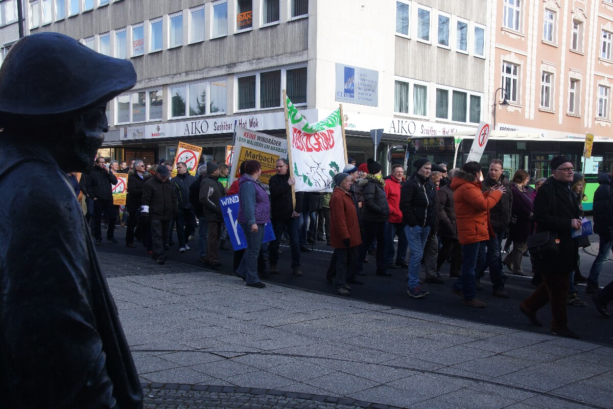 Vollkommen friedlich zogen die Demonstranten weiter über die genehmigte Route und vor dem Verwaltungsgebäude der Rhönenergie, sie ist neben der OVAG einer der Haupt-Subventionsabschöpfer  und Naturzerstörer in Hessen, kam es schließlich zu der Windwahnkundgebung.
