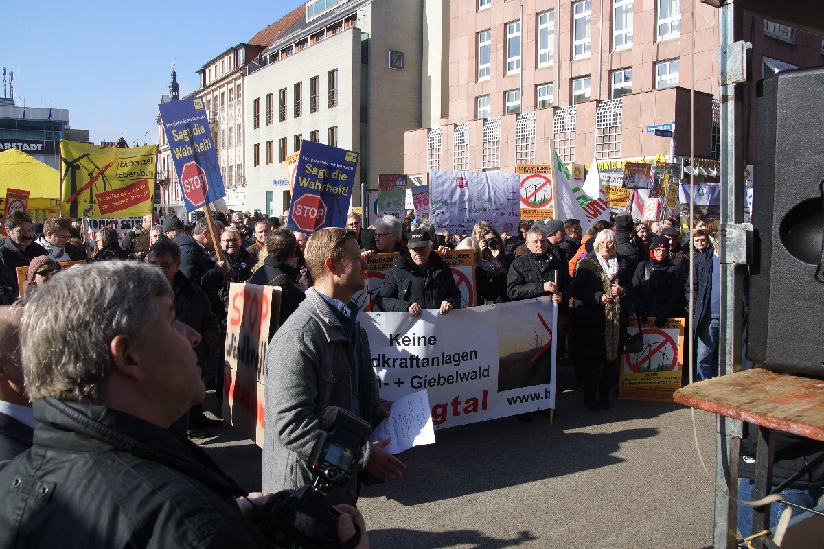 Jörg Clar Mitinitiator und Vorsitzender des Regionalverband Vernunftkraft Osthessen, begrüßte ca. 800 Demonstranten auf dem Bahnhofsvorplatz in Fulda. Mitglieder von Bürgerinitiativen aus Hessen und auch aus den Bundesländern Bayern, Nordrhein-Westfalen, Rheinland-Pfalz und sogar aus Niedersachsen waren angereist um sich gegen den weiteren Ausbau der Windindustrie in ihren Heimatgemeinden zu wehren.