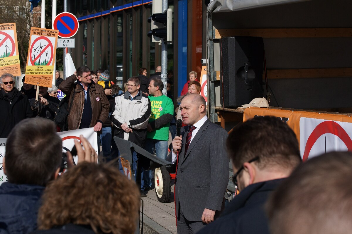 Jörg Clar Mitinitiator und Vorsitzender des Regionalverband Vernunftkraft Osthessen, begrüßte ca. 800 Demonstranten auf dem Bahnhofsvorplatz in Fulda. Mitglieder von Bürgerinitiativen aus Hessen und auch aus den Bundesländern Bayern, Nordrhein-Westfalen, Rheinland-Pfalz und sogar aus Niedersachsen waren angereist um sich gegen den weiteren Ausbau der Windindustrie in ihren Heimatgemeinden zu wehren.