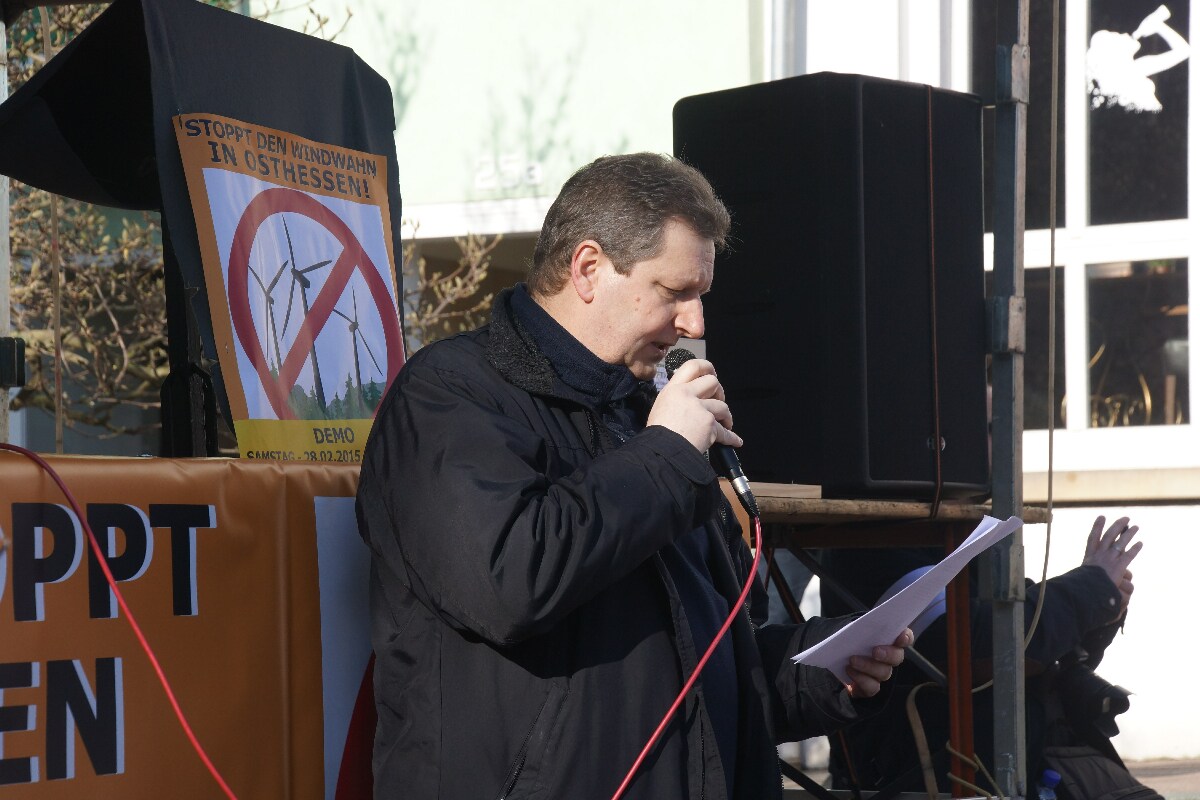 Jörg Clar Mitinitiator und Vorsitzender des Regionalverband Vernunftkraft Osthessen, begrüßte ca. 800 Demonstranten auf dem Bahnhofsvorplatz in Fulda. Mitglieder von Bürgerinitiativen aus Hessen und auch aus den Bundesländern Bayern, Nordrhein-Westfalen, Rheinland-Pfalz und sogar aus Niedersachsen waren angereist um sich gegen den weiteren Ausbau der Windindustrie in ihren Heimatgemeinden zu wehren.