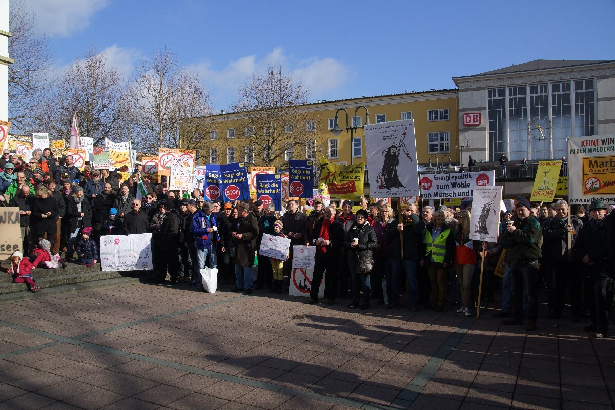 Jörg Clar Mitinitiator und Vorsitzender des Regionalverband Vernunftkraft Osthessen, begrüßte ca. 800 Demonstranten auf dem Bahnhofsvorplatz in Fulda. Mitglieder von Bürgerinitiativen aus Hessen und auch aus den Bundesländern Bayern, Nordrhein-Westfalen, Rheinland-Pfalz und sogar aus Niedersachsen waren angereist um sich gegen den weiteren Ausbau der Windindustrie in ihren Heimatgemeinden zu wehren.