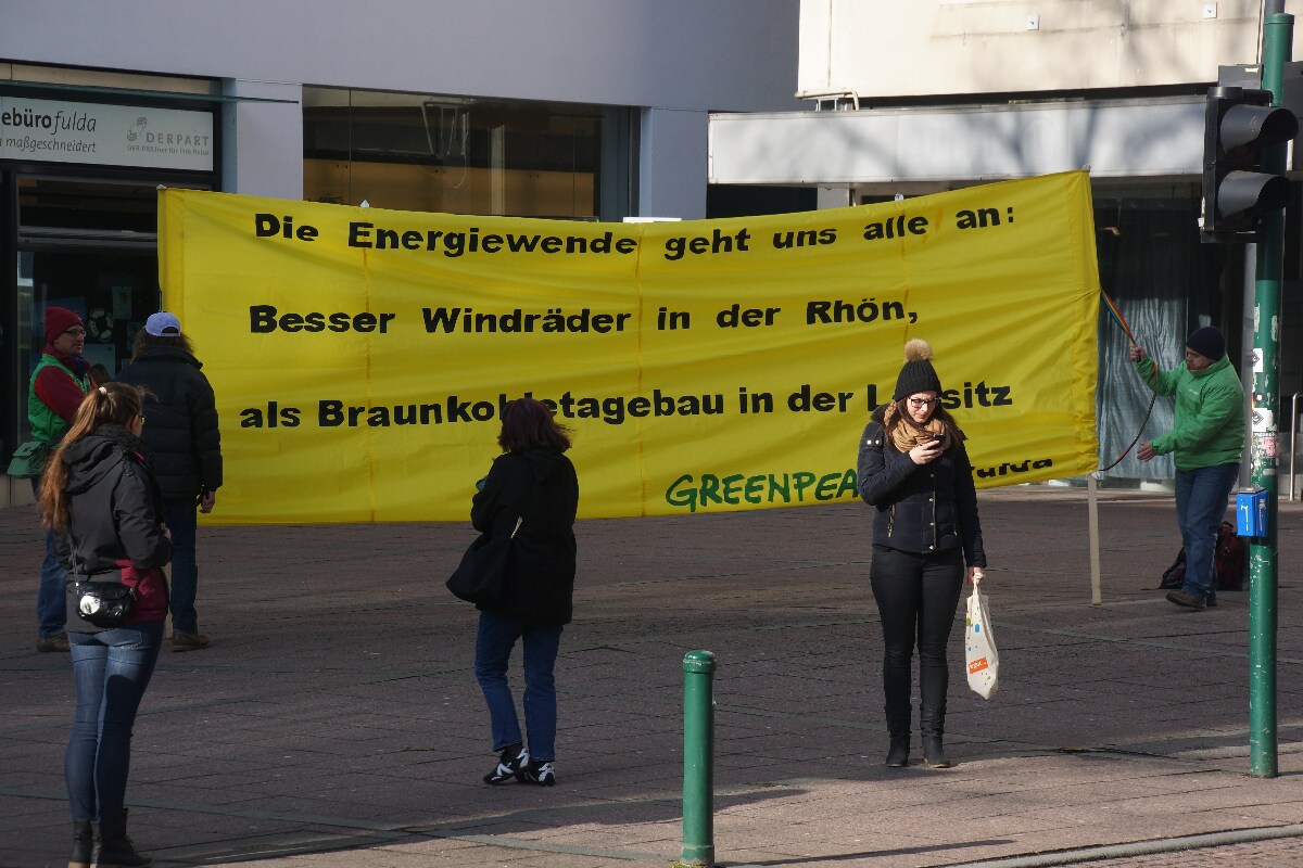 Vollkommen friedlich zogen die Demonstranten weiter über die genehmigte Route und vor dem Verwaltungsgebäude der Rhönenergie, sie ist neben der OVAG einer der Haupt-Subventionsabschöpfer  und Naturzerstörer in Hessen, kam es schließlich zu der Windwahnkundgebung.