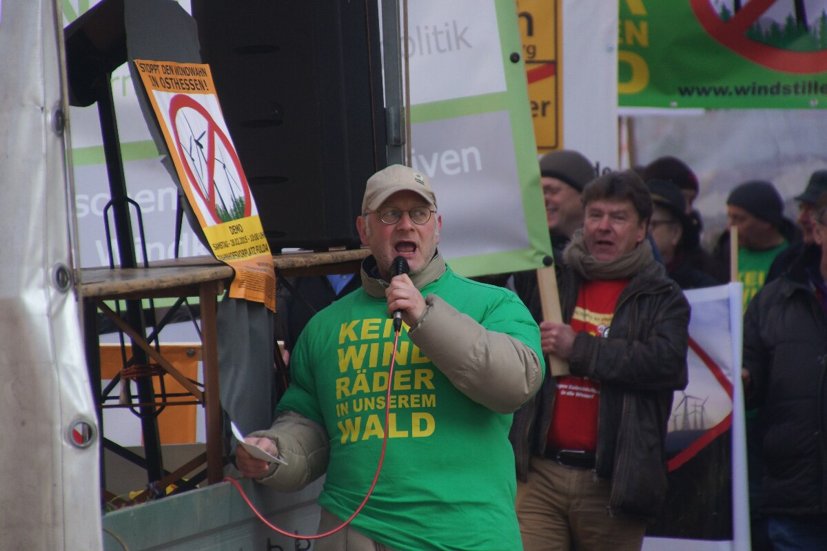 Jörg Clar Mitinitiator und Vorsitzender des Regionalverband Vernunftkraft Osthessen, begrüßte ca. 800 Demonstranten auf dem Bahnhofsvorplatz in Fulda. Mitglieder von Bürgerinitiativen aus Hessen und auch aus den Bundesländern Bayern, Nordrhein-Westfalen, Rheinland-Pfalz und sogar aus Niedersachsen waren angereist um sich gegen den weiteren Ausbau der Windindustrie in ihren Heimatgemeinden zu wehren.