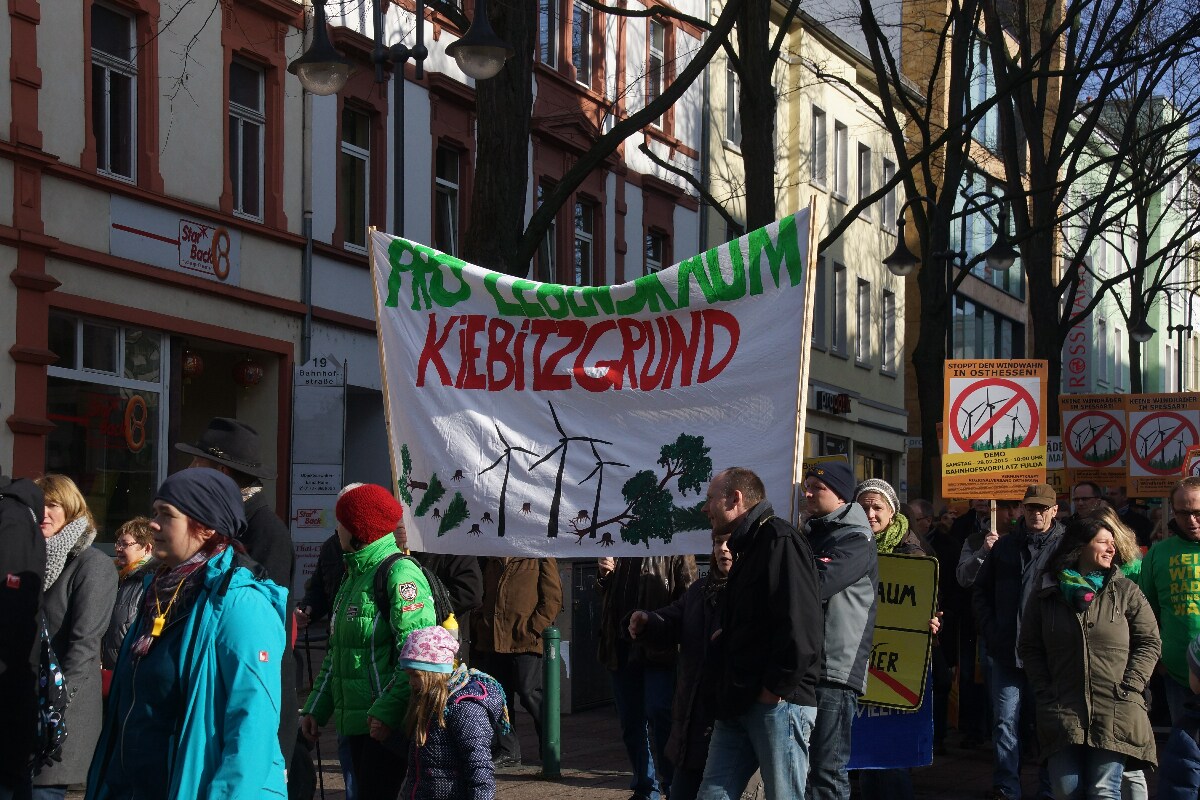 Vollkommen friedlich zogen die Demonstranten weiter über die genehmigte Route und vor dem Verwaltungsgebäude der Rhönenergie, sie ist neben der OVAG einer der Haupt-Subventionsabschöpfer  und Naturzerstörer in Hessen, kam es schließlich zu der Windwahnkundgebung.