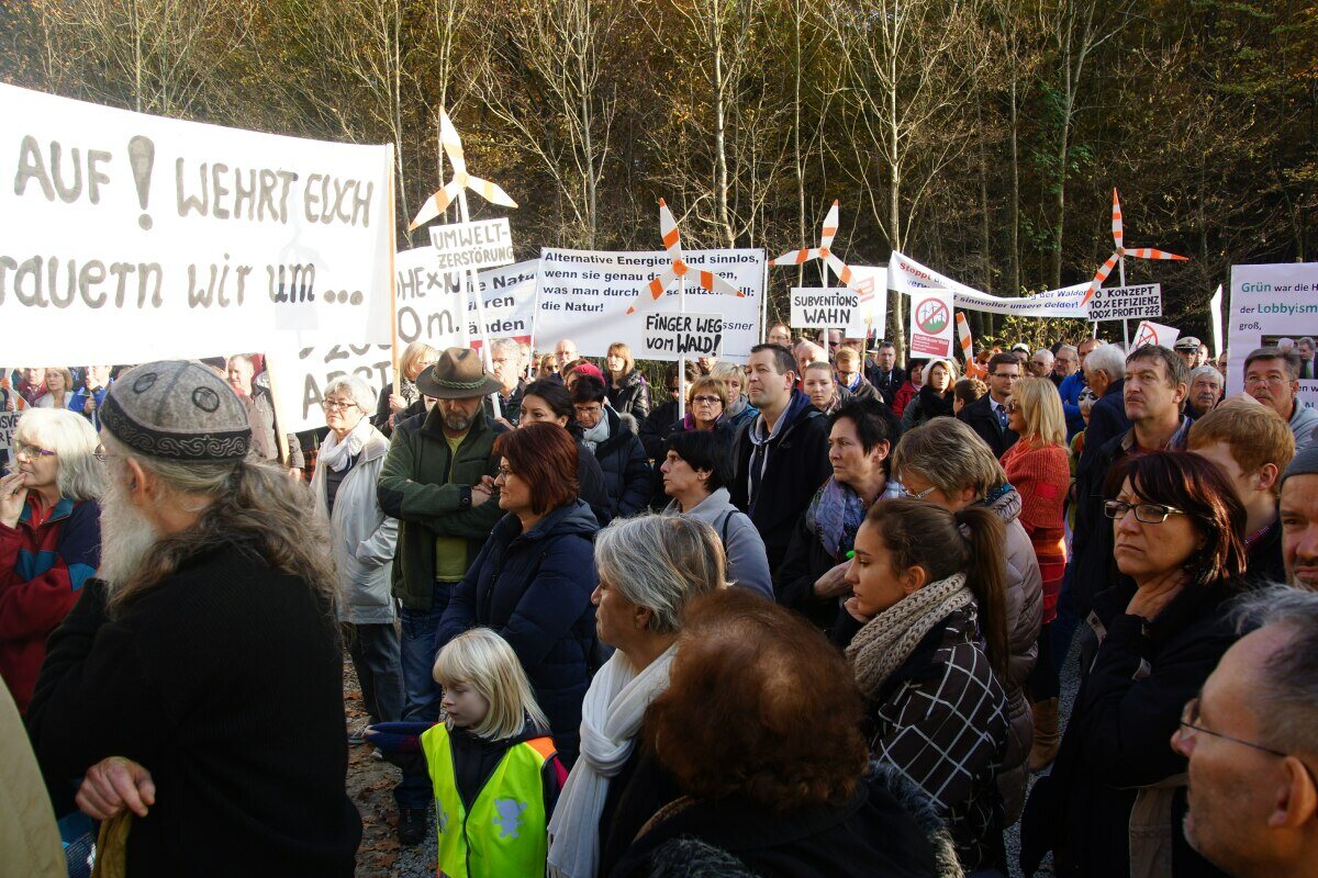 Anlässlich einer Einweihungsfeier von 14 Stück 207 Meter hohen Zufallsstromerzeugungsanlagen, bei denen sich der grüne Ministerpräsident von den Profiteuren und Ideologen dieser Energiewende feiern ließ, trafen sich auch circa 500 Menschen, zu einer Demo im Harthölzer Wald in Baden-Württemberg.