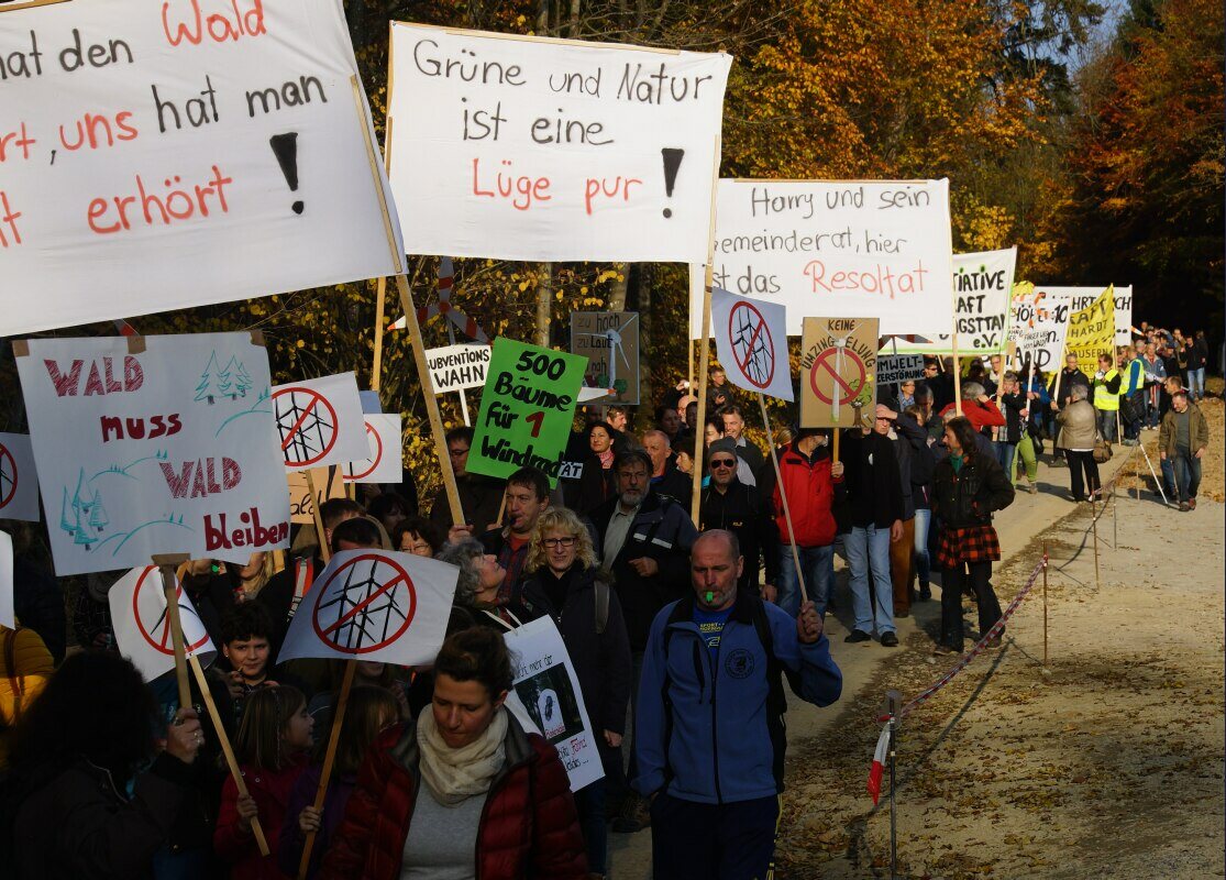 Anlässlich einer Einweihungsfeier von 14 Stück 207 Meter hohen Zufallsstromerzeugungsanlagen, bei denen sich der grüne Ministerpräsident von den Profiteuren und Ideologen dieser Energiewende feiern ließ, trafen sich auch circa 500 Menschen, zu einer Demo im Harthölzer Wald in Baden-Württemberg.