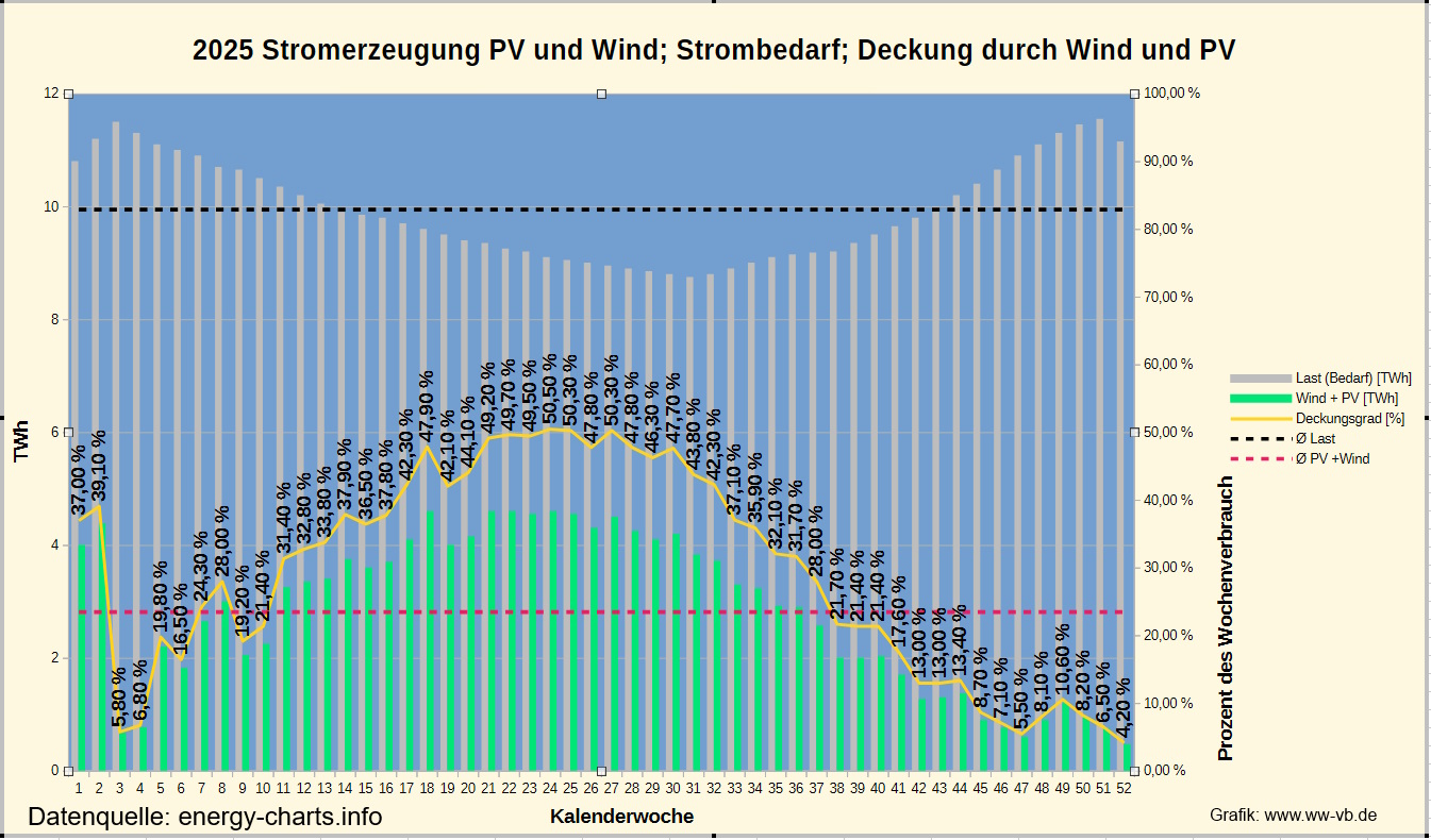Die Grafik zeigt, den in Kalenderwochen benötigten Strombedarf und stellt diesem, der Stromerzeugung aus Windkraft und PV gegenüber.