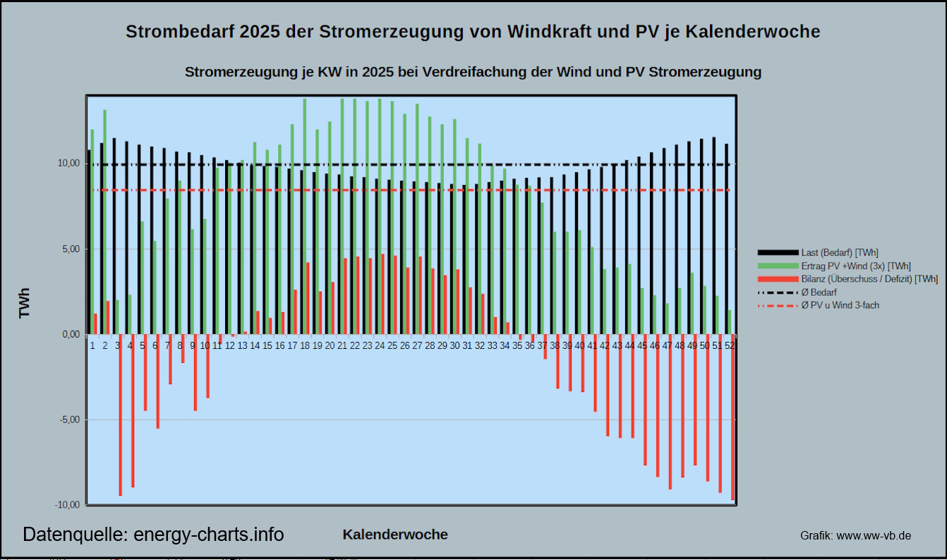 Diese Grafik zeigt den Strombedarf in 2025 je Kalenderwoche, dazu eine Stromerzeugung bei einer Verdreifachung der PV- und Windstromerzeugung