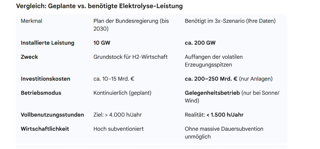 Die Realität Ihres 3x-Modells: Sie müssten 200 GW Elektrolyse-Leistung installieren, um den Strom nicht einfach „wegzuwerfen“ (abzuregeln). Das ist das Zwanzigfache der aktuellen Planung.