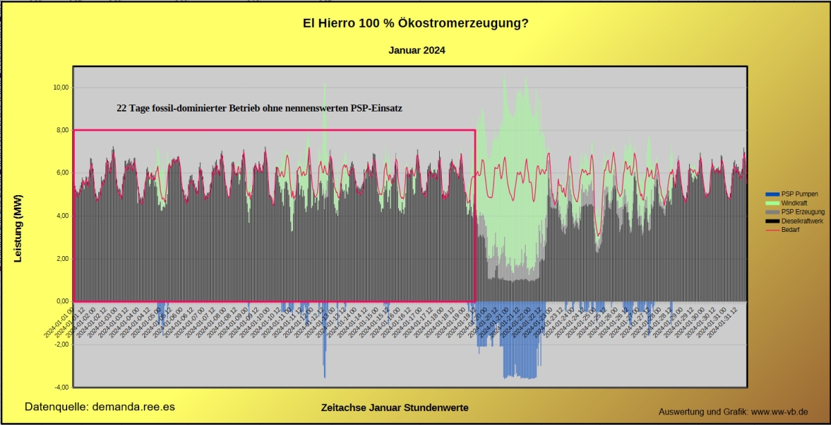 Wer die Energiewende verstehen will, darf nicht auf sonnige Sommertage schauen, sondern muss diesen Chart des Januars 2024 auf El Hierro betrachten. Er entlarvt die Propagandabehauptung der „100 % Öko-Insel“ als gefährliche Desinformation: