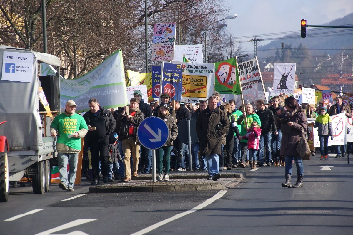 Vollkommen friedlich zogen die Demonstranten weiter über die genehmigte Route und vor dem Verwaltungsgebäude der Rhönenergie, sie ist neben der OVAG einer der Haupt-Subventionsabschöpfer  und Naturzerstörer in Hessen, kam es schließlich zu der Windwahnkundgebung.