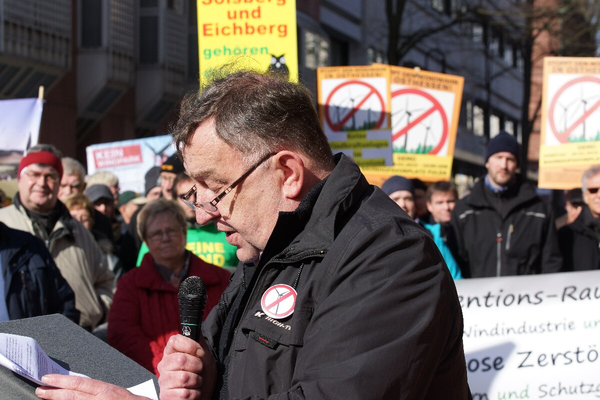 Jörg Clar Mitinitiator und Vorsitzender des Regionalverband Vernunftkraft Osthessen, begrüßte ca. 800 Demonstranten auf dem Bahnhofsvorplatz in Fulda. Mitglieder von Bürgerinitiativen aus Hessen und auch aus den Bundesländern Bayern, Nordrhein-Westfalen, Rheinland-Pfalz und sogar aus Niedersachsen waren angereist um sich gegen den weiteren Ausbau der Windindustrie in ihren Heimatgemeinden zu wehren.