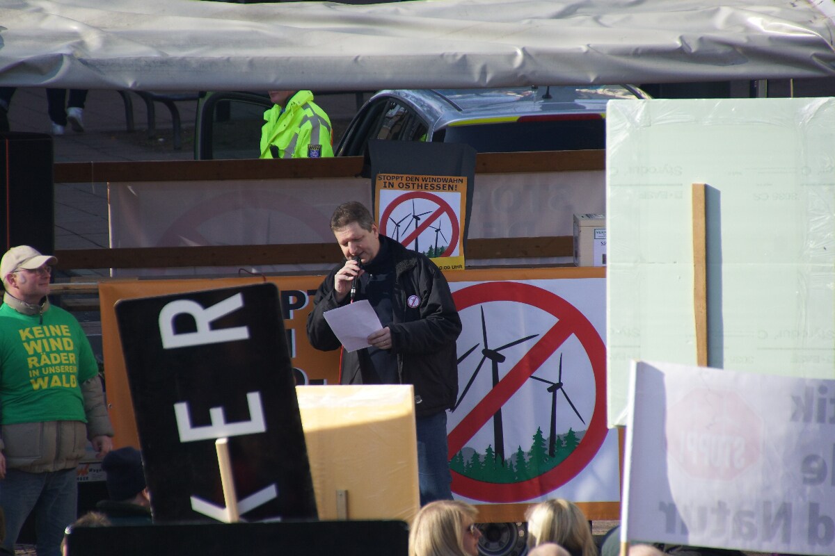 Jörg Clar Mitinitiator und Vorsitzender des Regionalverband Vernunftkraft Osthessen, begrüßte ca. 800 Demonstranten auf dem Bahnhofsvorplatz in Fulda. Mitglieder von Bürgerinitiativen aus Hessen und auch aus den Bundesländern Bayern, Nordrhein-Westfalen, Rheinland-Pfalz und sogar aus Niedersachsen waren angereist um sich gegen den weiteren Ausbau der Windindustrie in ihren Heimatgemeinden zu wehren.